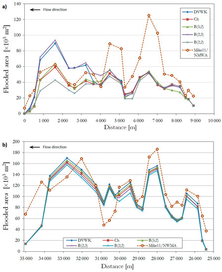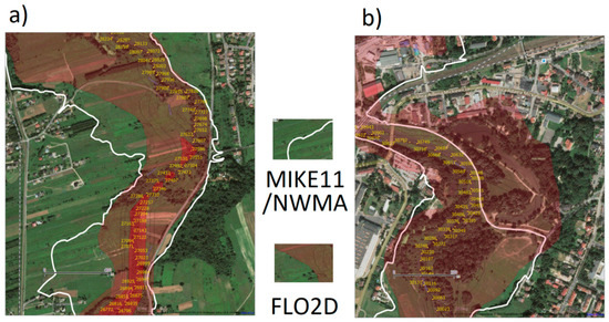 A detailed analysis was carried out by identifying areas and focusing on those locations where the zones generated by the FLO-2D model are the same, or underestimated (Figure 4a) or overestimated (Figure 4b), compared to the Mike11/NWMA application. On average, the difference in the areas of FLO-2D-B(2;2) and Mike11/NWMA zones is 17.1%, with local differences that may not occur or be much larger in specific locations.