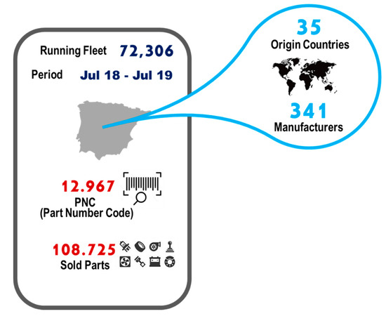 In the automotive industry, the level of competition is much higher than in the aeronautical sector, and so is the worldwide business volume. Therefore, this paper aims to analyze the impact of using AM as an alternative for the production of the spare parts on various KPIs, as well as the main operational implications. It takes a holistic point of view, encompassing the three main dimensions of sustainable supply chain management (SSCM), namely economic, environmental, and social. It focuses on the spare parts used by a mid-size car brand in its after-sales activities in Spain, including all the origin countries of the analyzed parts (Figure 1). The analyzed data correspond to the real sales of spare parts of a mid-size automotive brand in Spain (average running fleet of that brand: 72,306 vehicles) during a one-year period (from July 2018 until July 2019). In order to obtain relevant conclusions, the whole process, from the manufacturing plants to the retailer operations, has been taking into consideration.