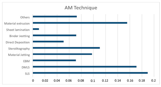 - For those parts that could be formed using AM techniques, and whose production process using AM was considered worthwhile, which would be the most appropriate AM technique? For each component, the specific AM technique that best suits its manufacturing process depends on its inherent characteristics (shape, material, size, etc.). The resulting breakdown for the parts being considered parts, based on the experience of the authors, is shown in Figure 2.