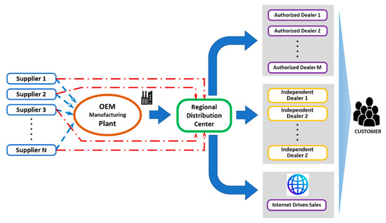 In the “traditional” business model, the final customer is supplied directly from the dealers, which are in turn supplied by the regional distribution center, as no one else is capable of placing orders to the original parts’ suppliers. However, in the proposed model (Figure 4), the final customer could be directly supplied by nearly all the stakeholders (authorized dealers, independent dealers, the manufacturer, etc.), and could eventually place the order by himself. There are three main possible flows for the spare parts: