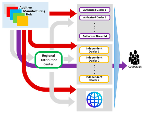 Once the use of additive manufacturing is considered, the characteristics of most manufacturing systems and processes can be seriously affected. Although it is still difficult to predict how, when, and up to what extent is AM going to affect the business models, it seems to be widely accepted that it will have a very important impact, whatever the industrial sector and whichever the stakeholder being considered. Some very good analyses can be found in [25] for end users, [26] for the medical sector, [27] for general industrial activities, or [11] for the aeronautical field. In the automotive spare parts sector, and for the case study that is presented in this paper, the utilization of AM manufacturing technologies would allow, for those parts, the implementation of a new distribution model such as the one schematically shown in Figure 4.