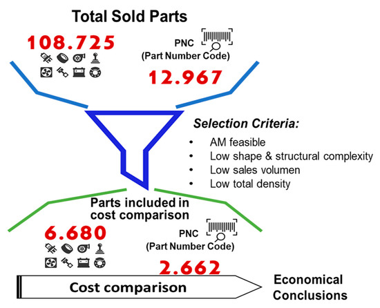 Among the total parts’ sales in the period being analyzed, only those that could be manufactured using AM techniques were compared in terms of alternative manufacturing costs. The selection criteria, taking into consideration the current technologies and situation, are described below.