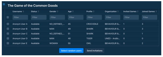 Figure 1. Screen of the BECO Games platform to send joining invitations to the registered users. - Users can provide their behavior profile by filling in an adapted version of the ten-item personality inventory to measure the Big Five personality traits [20], namely agreeableness, conscientiousness, extroversion, openness to experience, and neuroticism. The numerical values are classified into traits with regard to those provided by the rest of the registered students. The traits are then mapped on animal names (lion, tiger, dog, etc.) to facilitate filtering during the user invitation process.