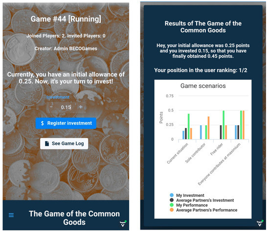 - Once there are enough players to play, the teacher can start the game, and consequently, the participants will have to decide how much to invest (up to 0.25) in the common goods (Figure 3, left).