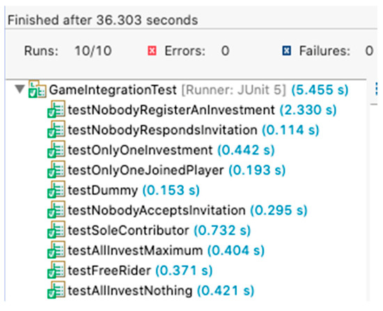 - Manual and JUnit-based automated tests, which allowed to check if all the possible game scenarios, ranging from poor or null investments to the highest ones, and the user invitation system were correctly managed. Additionally, they checked whether non-functional requirements were properly implemented, such as authentication and authorization mechanisms, concurrency control, communication with external mail servers, asynchronous web notifications, and its responsive interface.