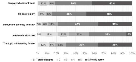 In general terms, students value the game positively. The aspects of the game with the highest scores were: ease of playing, being able to play at any time, and clarity of instructions. In these three cases, more than 75% of the students that answered the survey were quite (5) or totally satisfied (6), as can be seen in Figure 6.