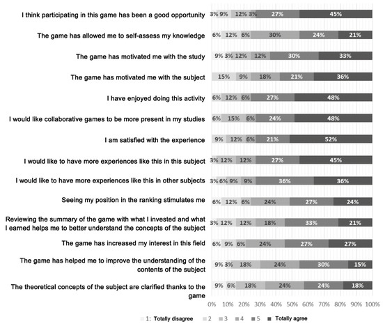 This fact is consistent with their positive assessment, given the fact that there are more similar experiences both in this subject and in the other subjects of the degree, and with their satisfaction with the experience (approximately, 72% of the subjects participating in the survey granted the values 5 and 6). On the opposite extreme, although also with a high degree of agreement (between 66% and 73% of the students answering the survey considered it positive (values 4, 5, and 6)), there is a perception that the game allowed them to clarify the theoretical concepts of the subject, and it allowed them to improve the understanding of the contents under study.