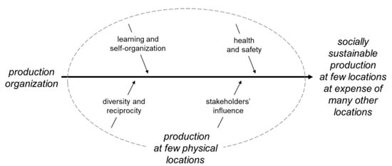 The causal diagram [41,42] in Figure 1 summarizes that production at few physical locations undermines the international social sustainability of international production. The causal variables shown in Figure 1 are indicative of social sustainability issues found to be important in previous studies by others [36,37,38,39,40]. Consider, for example, how increasing the sophistication of production can contribute to the concentration of physical production in a reducing number of locations. For example, Industry 4.0 involves applying cyber-physical systems to production in addition to automation from Industry 3.0, assembly lines from Industry 2.0, and mechanization from Industry 1.0 [43,44]. Such highly sophisticated production can involve overriding natural evolutionary constraints by drawing natural resources from around the world to a few locations [4,5]. Also, it can override natural evolutionary balance of ecological fitness among a wide variety of populations [45] by increasing the number of fitness components needed for survival [46]. For example, from mechanization to assembly lines to automation to cyber-physical systems [47]. Where there is natural evolutionary balance of ecological fitness among a wide variety of populations, it can be expected that a wide variety of populations will survive. By contrast, it can be expected that fewer populations will survive when natural evolutionary balance of equal ecological fitness is lost. For example, current international production reduces international social sustainability [9,10] and reduces the potential for some populations to survive where they have lived for previous generations. Already in 2015 during the Africa-EU Migration Summit in Malta, it was stated that Africa needs to industrialize in order to generate sufficient employment to reduce mass migration [48]. However, lack of international socially sustainable industrialization continues, and mass migration carries on at high human cost [49,50,51]. Thus, as summarized in Figure 1, the concentration of physical production at few physical locations can undermine causal variables for socially sustainable production internationally.
