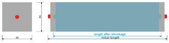 The changes in volume were tested by the dilatometric method (according to [9]—the principle demonstrated in Figure 2). Each sample consisted of five prisms, readings of which were taken at 1–3, 5, 7, 14, and 28 days. The first reading was taken almost immediately after the demolding of the samples and was considered the “zero” or “reference” reading. Note: The dilatometric method does not permit capturing the changes in volume that take place at ages 0 and 24 h.