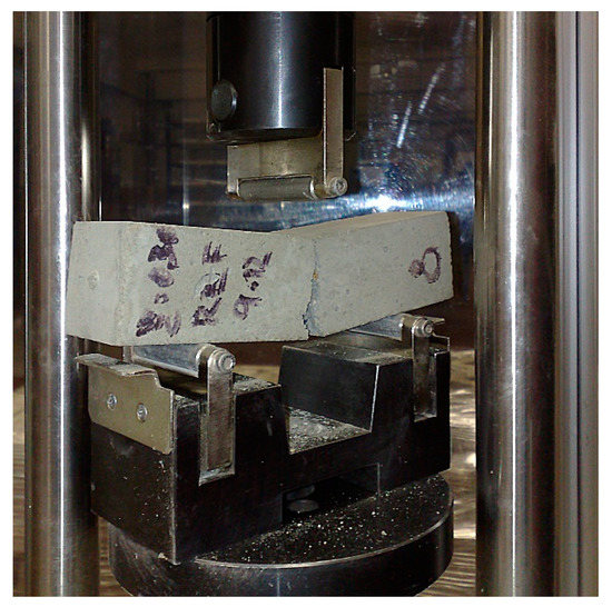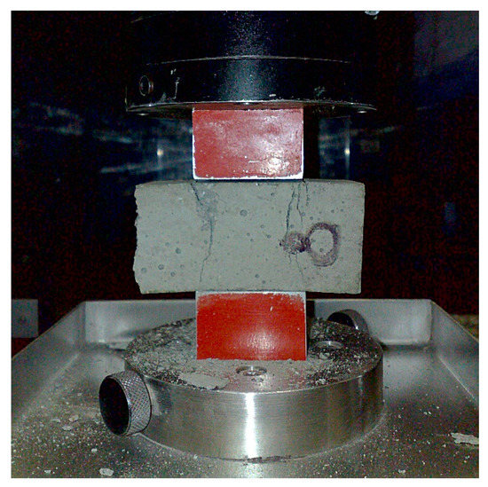 The flexural tensile strength and compressive strength were tested according to [6] (Figure 3 and Figure 4). The flexural tensile strength was always determined with three specimens at ages 7, 14, and 28 days. The primary purpose of this test was to test the compressive strength of the fragments. The flexural tensile strengths were used as the control results for the compressive strength tests, with an empirically defined ratio ft,fl(t):fc(t) = 1:7.