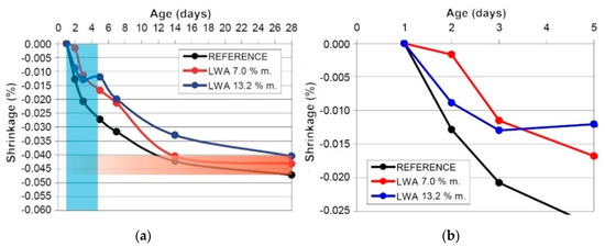 Figure 7a,b shows the evolution over time of the changes in volume of the samples with a very low w/c ratio of 0.30 (αmax = 0.83). From the maximum degree of hydration, it is obvious that the reference sample (without IC) must necessarily undergo self-desiccation and, therefore, significant changes in volume [15]. Through our qualitative analysis of the results, we drew the partial conclusion that IC using 7% and 13.2% of LWA caused a reduction in the changes in volume (in line with previous observations [16]). The reduction on the 28th day can be expressed as 0.015%. Under the assumption that an ideal IC is considered a state when any changes in volume are eliminated, then it can be concluded that under these conditions, the efficiency (difference in shrinkage on the 28th day) of the IC was achieved at approximately 25% (regardless of the dosage of LWA). The contribution of individual dosages of LWA was not reliably determined. The blue area (Figure 7a) highlights the other significant finding. IC postpones the initial changes in volume (in line with [16]), which is favorable due to the higher strengths (as unrestricted changes in volume practically do not exist). The changes in volume at an early age are captured in detail in Figure 7b. It is clear that a change in volume (shrinkage) while IC is used appears for the first time on the second day. This means that until this time, the IC is 100% effective. As seen in Figure 7b (later also Figure 8b), the most likely behavior of the samples with IC during the period that was captured by the measurements should be explained. The samples with IC contained some quantities of curing water, which resulted in a slight swelling, which was also observed in [16,17,18,19]. Then, the shrinkage starts from an “elongation”, and the rate of changes in volume between the first and second day is proportional to the quantity of water released during the swelling of the concrete.