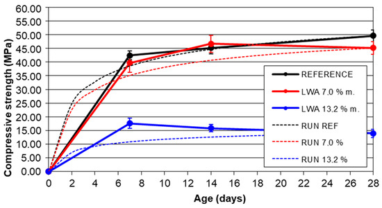 The compressive strength was determined (following [6]) on fragments of the “mortar” prisms, which is interpreted as the mean cube strength at a certain age (7, 14, and 28 days). With these tests, we verified the effect of the LWA dosage on the mechanical performances at various w/c ratios (w/c = 0.30, 0.36, and 0.42) during exposure to the ambient temperature of 20 ± 2 °C and RH 95 ± 5% (achieved RH = 98%), see Table 3. The mean compressive strengths fcm(t) at age t (MPa) were supplemented by the expected evolution of the compressive strength (following the model in [21]), where the coefficient respecting the age of the concrete and medium compressive strength on the 28th day (MPa) occurs. The formula represents the exponential character of the evolution of the compressive strength over time t (d).