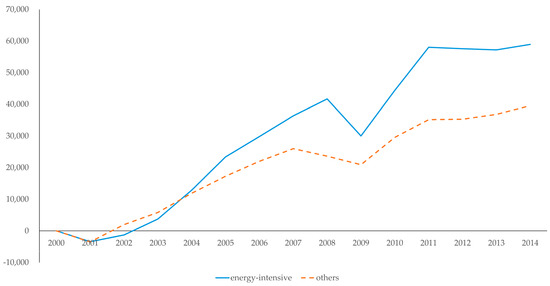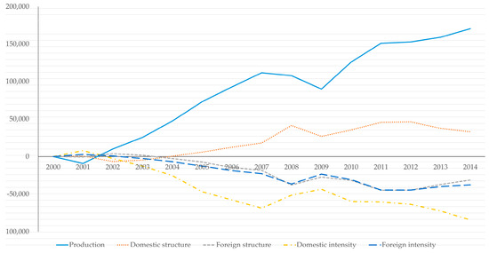 Figure 1 displays production, domestic-structure, foreign-structure, domestic-intensity, and foreign-intensity effects for the whole industry according to cumulative change from 2000 to 2014. Consistent with the previous literature, the production effect is a main driving force in increasing energy consumption. The impact of economic activity on energy consumption weakened during the financial crisis from 2007 to 2008. Domestic-structure effects also have affected an increase in energy consumption. Energy-intensity effects have weakened: energy factors are used less to produce one unit of value-added in the corresponding industry. The GVC components, both foreign-structure effects and foreign-intensity effects declined. This means that, in the process of production of intermediate goods, domestic energy is efficiently consumed to produce value-added for foreign intermediate goods. Industries that import more intermediate inputs have tended to be less energy-intensive than others.