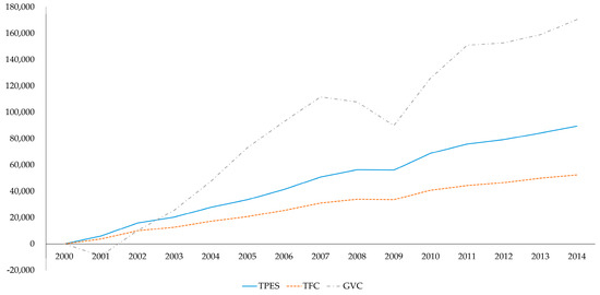 Table 3 shows the change rate in energy consumption and value-added for the 14 production sectors between 2000 and 2014. Overall, total energy consumption increased by 36.66% and 19.92% in TPES and TFC, respectively. There was no such remarkable difference between the change rate of TPES and TFC, except for transport equipment and agriculture/forestry/fishing. The differences in change rates between TPES and TFC depends on the electrification of each sector and the conversion efficiency in the generation sector. On the other hand, the value-added measured by GVC and real GDP shows significant differences because GVC reflects foreign economic situations in consideration of international trade. According to GVC data, Korean value-added increased by 192.40%, while real GDP increased 75.63%. For the mining and quarrying sector, while real GDP decreased, the value-added measured by GVC increased. This implies that the domestic mining and quarrying industry sector has diminished, and the Korean domestic industry has relied heavily on foreign mining and quarrying industries.