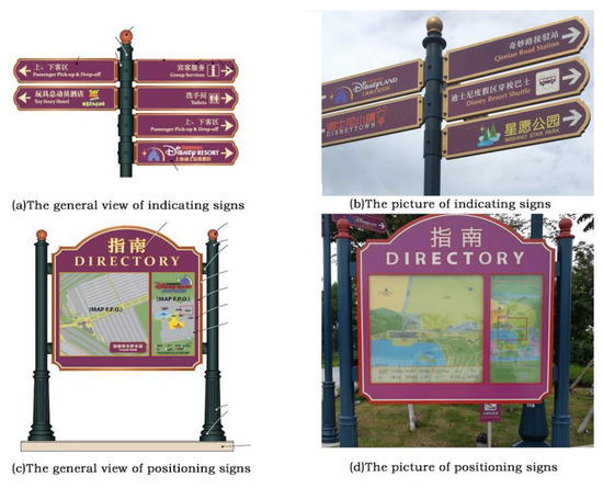 We adjusted details according to the content and layout of the signboards. To prove the effectiveness of the proposed method, we conducted a questionnaire survey of tourists to Disneyland before and after this adjustment. We conducted the survey from 2:00 p.m. to 6:00 p.m. on weekdays and 12:00–20:00 on weekends. A selective (age, gender) survey was carried out for tourists. The on-duty traffic police and traffic service personnel (traffic manager, traffic guide) were also interviewed. A total of 300 tourists were surveyed, where 294 responses were valid for an effective recovery rate of 97.7%. The statistical results show that 80.2% of the respondents thought that the public information system was essential or very important. The problems recognized by them were deficiencies in each element of the wayfinding system, unreasonable spatial layout of the public information guidance system, and a lack of information transmission between signage and resorts; for instance, there is no follow-up identification information after half the journey.