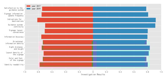 In the questionnaire survey shown in Table 4, the weights of the 11 evaluation indices for satisfaction evaluation were determined by the expert estimation method based on quantitative and qualitative analyses. The determined weights of the 11 evaluation indices were as follows: the readability takes 5%, color and font of the sign takes 5%, density of the layout of the sign takes 5%, sight distance and height takes 5%, oriented information density takes 5%, information accuracy takes 20%, convention of sign layout takes 5%, continuity of guidance system takes 10%, indications for important destinations takes 20%, frequency of update of signage information takes 10%, and satisfaction with the guidance system takes 10%.