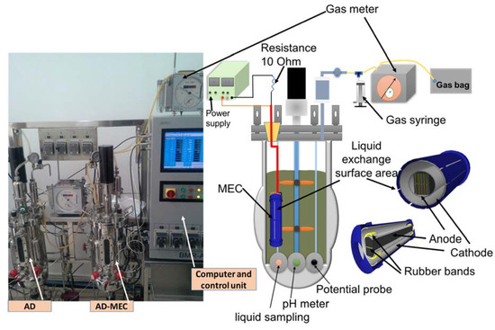 - Hassanein, A.; Witarsa, F.; Guo, X.; Yong, L.; Lansing, S.; Qiu, L. Next generation digestion: Complementing anaerobic digestion (AD) with a novel microbial electrolysis cell (MEC) design. Int. J. Hydrogen Energy 2017, 42, 28681–28689. [Google Scholar] [CrossRef]