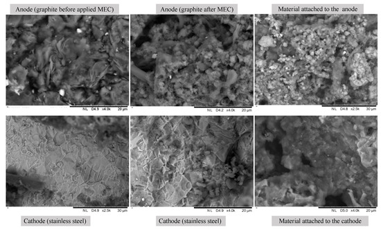The scanning electron microscopy (SEM) images on the anode surface showed bacterial cell colonization and growth. These cells were likely exoelectrogens, electricigens, and anodophilic bacteria that promoted substrate breakdown and electricity production (Figure 2) [31,32]. The anode (graphite) surface was completely covered with attached biofilm after the 11 days of the MEC inclusion, as confirmed by the SEM analysis. Coccoid and rod-shaped bacteria dominated the biofilm. It appears that 11 days were sufficient for the bacteria to colonize and acclimate to the anode graphite plates to form the biofilm needed to degrade the organic material (dairy manure). The SEM analysis also showed a denser microbial adherence on the graphite compared to stainless steel due to the porous structure of graphite materials [33].