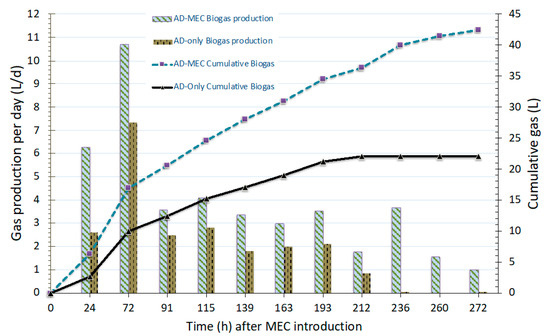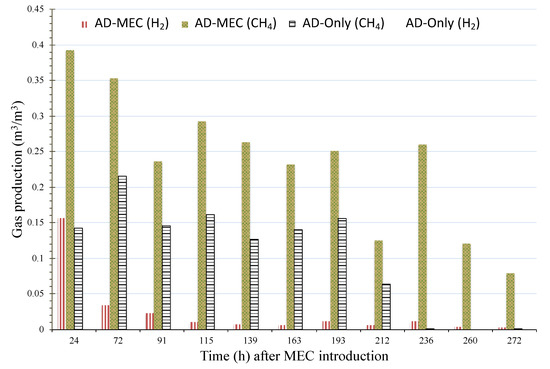 Overall, the AD-MEC produced 149% more daily useful gases (H2 and CH4) (0.26 m3/m3/d) compared to AD-only (0.11 m3/m3/d) over the 11 additional days of digestion. The daily production rate of H2 and CH4 in the AD-MEC treatment reached a maximum of 0.16 m3H2/m3/d and 0.39 m3CH4/m3/d within the first 24 h. During the 11-day period, a cumulative H2 + CH4 production rate of 2.87 m3/m3 was observed for the AD-MEC treatment, compared to 1.15 m3/m3 observed for the AD-only treatment.