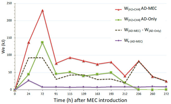 Higher energy production was observed for the AD-MEC treatment (WAD-MEC = 964 kJ) compared to the AD-only treatment (WAD-only = 434 kJ). The total energy needed (electricity) to run the MEC (We(AD-MEC) = 107 kJ) was only 20.2% of the extra energy produced by the AD-MEC treatment, compared to the AD-only treatment (WAD-MEC – WAD-only), and 11.1% of the AD-MEC’s total energy production (WAD-MEC) (Figure 5).