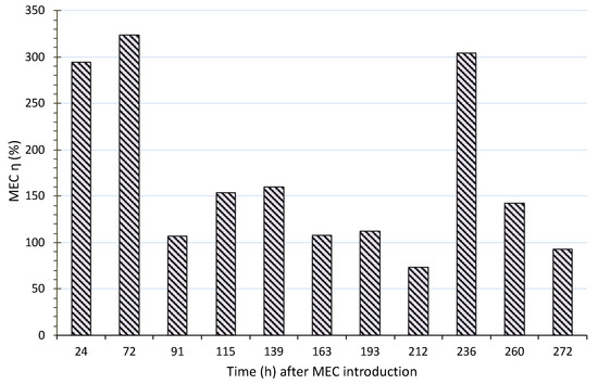 The energy recovery efficiency, based on the extra energy produced (WAD-MEC – WAD-only) from the AD-MEC over the electrical energy needed to operate the MEC, ranged from 73.1% (ηE min.) to 324% (ηE max.), with an average increase of 170% over time (Figure 6). Huang et al. (2020) showed that coupling AD and MEC in the same chamber to treat food waste resulted in a 238% energy recovery efficiency when operated under negative pressure [47]. In the current study, the energy return was also greater than the input energy required to operate the MEC.