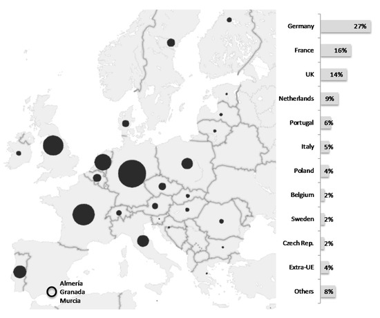 - García-Barranco, M.C.; Pérez-Mesa, J.C. Influencia de la Distribución Europea en la Gestión Logística del Exportador: El caso de España, Alemania, Francia y Países del Este; Universidad Almería y Cátedra de Logística de Andalucía: Almería, Spain, 2015; Volume 45. [Google Scholar]