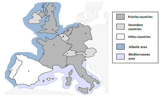 4.5. Gravity Model Applied to the United Kingdom, the Atlantic and Mediterranean Export Areas