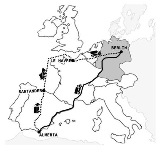 - Pérez-Mesa, J.C.; Céspedes, J.; Salinas, J. Feasibility study for a Motorways of the Sea from Almeria (Spain) to Port Vendres-Perpignan (France). Application to the transportation of fruit and vegetables. Transp. Rev. 2010, 30, 451–471. [Google Scholar] [CrossRef]