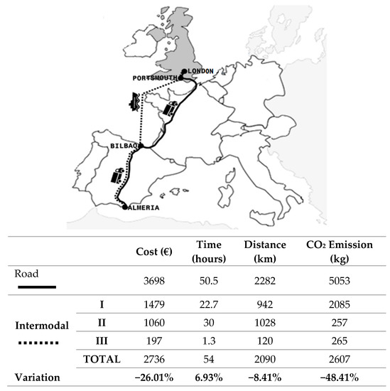 - Identification of optimal unloading endpoints: By searching for operators and conducting an analysis of existing routes, although for other kind of goods. This strategy accelerates the implementation of intermodality against the creation of ad hoc maritime routes. For example, facilitating the groupage of loads, which was carried out using the transport chain simulator CoModalWeb 2.0. This tool was designed by the Ministry of Public Works and Transport in collaboration with the Spanish Short Sea Promotion Center, the University of Cantabria, the European Short Sea Network, and the Port Authorities of the main Spanish ports. Among all options shown by the simulator, the shortest transit time route was chosen as it is the most important selection criterion for perishable products (see Table 1). A preliminary analysis of this work can be seen in [38].