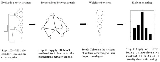 A hybrid model for evaluating comfort in an aircraft cabin system is proposed and introduced, which integrates the DEMATEL method with multi-level fuzzy comprehensive evaluation [28]. The DEMATEL method is used to construct the interrelationship between criteria and calculate their weights according to their importance important degree. Multi-level fuzzy comprehensive evaluation is applied to deal with the subjectivity of evaluation and quantify the comfort level.