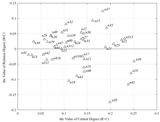 (R + C) is denoted as the central degree, which can be obtained by calculating the value of when i = j. It represents how important the criterion i is. (R − C) is denoted as relation degree which can be obtained by calculating the value of when i = j. It indicates the effect criterion i contributing to the whole evaluation system. According to the value of (R − C), the criteria could be classified into a cause group () and an effect group (). The criteria in the cause group indicate that they have a great effect on others. The criteria in the effect group mean that they are highly affected by others.