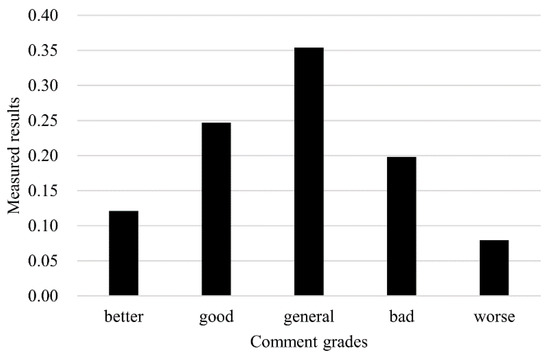 According to the calculating result, these five numbers represent the scores of comfort level calculated with the hybrid model. The comfort evaluation result is displayed in Figure 3. It shows that the results of cabin comfort affiliated with “better”, “good”, “general”, “bad” and “worse” are 0.1213, 0.2468, 0.3543, 0.1983 and 0.0793, respectively. According to the maximum membership principle, the comfort level of this aircraft cabin system is regarded as “general”, which needs to be improved in the future.