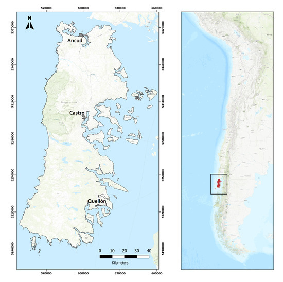 Chiloé Island is located between latitudes 41°4′ and 43°2′ S in southern Chile (Figure 1). According to the last available data [123], the population of the island amounts to 180,185 inhabitants, divided into 10 municipalities. Until 1980, Chiloé’s economy depended on subsistence-oriented agriculture, artisanal fishing and woodcutting [114]. From the 1980s onwards, the island became a center of the world salmon industry. Currently, it is the second global producer after Norway [124].
