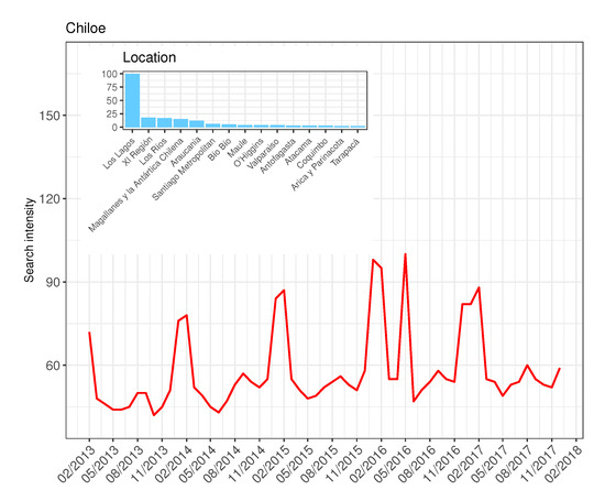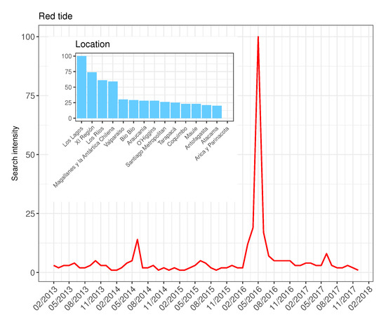 The search intensity data are obtained from Google Trends. We specify the region as CL (Chile) and use two terms “marea roja” (red tide) and “Chiloé” (Chiloé) as search keywords. We collected the Google data from 1 January 2004 to date of collection (1 February 2020). The data were obtained using R 3.6.1 gtrendsR package version 1.4.4 to search the time series.