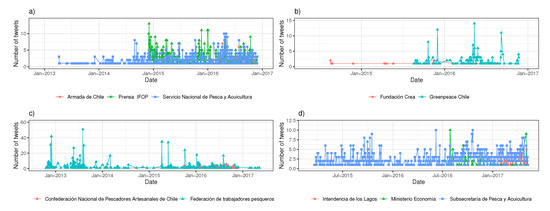 As seen, several actors –particularly sectorial ones and Greenpeace– were already active in the analyzed topics before the beginning of the red tide crisis. For most of them, a spike can be detected as the crisis begins, although the general distribution does not differ significantly from the observed behavior before or after. There are, however, actors that start tweeting on the relevant topics of the corpus (see Table 3) as an effect of the crisis. Some of them are sectorial actors, such as the National Federation of Chilean Fishermen (Conapach) and the Fisheries Promotion Institute (IFOP), while others are not directly involved with the fishing sector, such as the Ministry of Economy (Minecon), local authorities (Intendencia), the Navy (Armada de Chile) and Crea Foundation. Noticeably, most of them remain active at tweeting relevant topics of the corpus months after the events, showing that Twitter users continue posting on the crisis long after the phenomenon passed, as argued by Ref. [43].