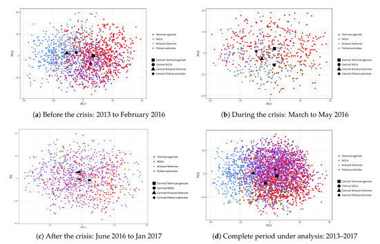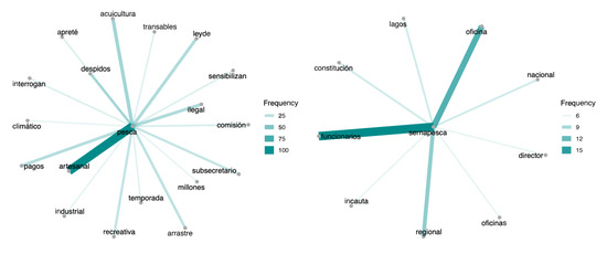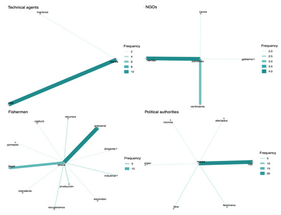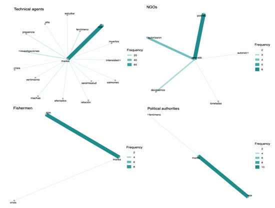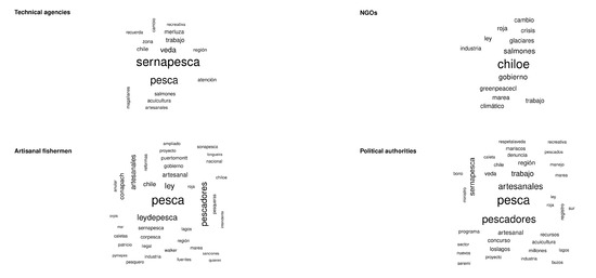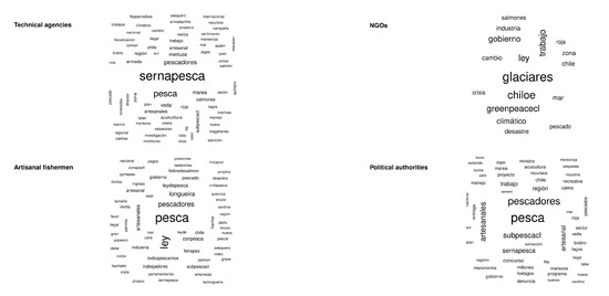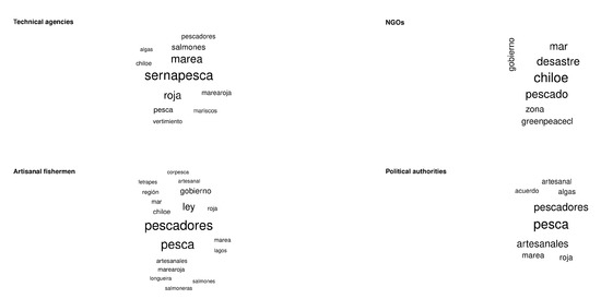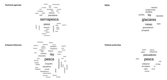 As shown, there are divergences and congruencies regarding the meaningful topics for each group. In Figure 5 (before the crisis), we can observe that “fishing” (pesca) and particularly “fishing regulations” (ley de pesca) are two of the most significant topics for technical agencies, fishermen and political authorities, while NGOs are not interested in the particular topics relevant for the island, but on general issues such as climate change and the melting of glaciers. Fishing regulations is a significant topic for artisanal fishermen and for the fishing industry as well because it defined several aspects regarding the political economy of the island, such as fishing sectors, fishing quotes, ban on fishing particular species and concession periods for the industry [131].