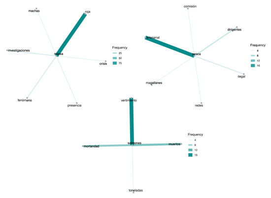 Interestingly, as shown in Figure 6 (during the crisis), the topics red tide (marea roja) or Chiloé disaster (desastre) become central for technical agencies and NGOs, while the topics fishing and fishermen are significant for artisanal fishermen and for political authorities. Even fishermen keep more or less the same of topics before, during and after the crisis, focusing on a critical discussion on fishing regulations affecting artisanal fishing and shellfish extraction. Certainly, the topic red tide turns out to be relevant for fishermen and political authorities as well, yet the former read the crisis as a problem of employment and subsistence (fishing), while the latter observes this as a political problem in need of an agreement (acuerdo). As Ref. [42] find out, Chiloé inhabitants and particularly fishermen are used to red tides. They know how to identify secure sectors for shellfish extraction and fishing. However, the dimensions and intensity of the 2016 red tide crisis were so extraordinary that there was no place to move the work activity. Thus, the red tide became a factual work prohibition.