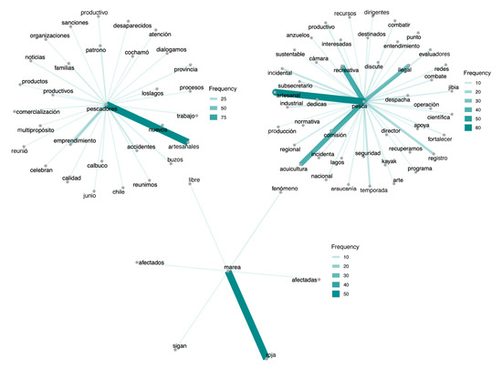 Word clouds are one of the easiest ways of visualizing both the meaningful boundaries of different discourses as well as the relevant topics the actors are interested in. A more detailed view on the meaningful construction of discourses is offered by egocentric networks. In Figure 9, Figure 10 and Figure 11, we observe different networks of meaning construed from the perspective of relevant concepts of the crisis, such as artisanal fishing, red tide, dumping of salmons, and Sernapesca (the National Fishing Service).