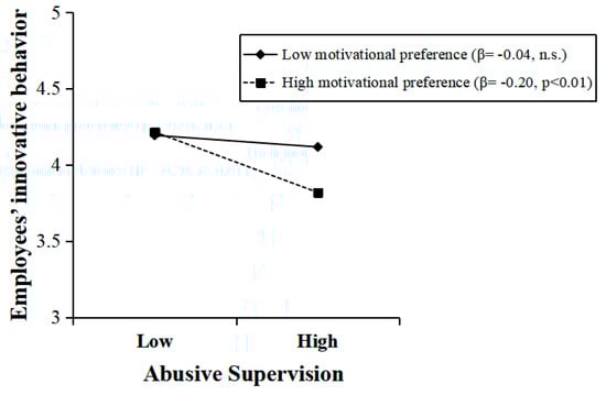 From the perspective of SDT, autonomy, competence, and relatedness are the three basic psychological needs that should be continuously met in one’s life [34,65,66]. Individuals with more IMP (i.e., a higher level of motivational preference) focus more on their inner desires, looking forward to the fulfillment of their internal goals and experiencing positive emotions by completing the task itself [67,68]. However, when faced with abusive supervision, they are more likely to regard it as a personal offense that conveys supervisors’ doubts about employees’ autonomy and competence. At the same time, the joy of innovative behavior itself is diminished by the chronic suppression of abusive supervision. It then negatively affects EIB. In contrast, individuals with more EMP (i.e., a lower level of motivational preference) are motivated to complete tasks due to external rewards or punishment avoidance [49]. Their innovative behaviors are often driven by rewards, such as financial incentives, rather than by leadership styles. Therefore, when external incentives are high enough, workers can effectively adjust their emotions and maintain high innovative behavior despite abusive supervision. Furthermore, it can be inferred that a lower motivational preference could alleviate the negative effect of abusive supervision on innovative behavior.