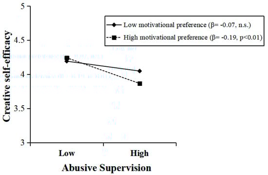 To better understand the moderating effect, we followed the procedures of Aiken et al. [75] and calculated two types of the mean of motivational preference to plot the interaction. As shown in Figure 2, the interaction plot confirmed Hypothesis 3. More precisely, abusive supervision is more negatively related to innovative behavior when motivational preference is high (i.e., more IMP) (β = −0.20, p < 0.01) than when it is low (i.e., more EMP) (β = −0.04, n.s.). Hence, H3 is supported. Similarly, as shown in Figure 3, the interaction plot confirmed Hypothesis 4. More precisely, abusive supervision is more negatively related to CSE when motivational preference is high (i.e., more IMP) (β = −0.19, p < 0.01) than when it is low (i.e., more EMP) (β = −0.07, n.s.). Hence, H4 is supported.
