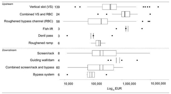 Financial and economic costs are associated with upstream and downstream passage facilities. Table 1 outlines the specific types of financial and economic costs associated with both. Notably, there were differences for maintenance, legal costs, as well as compensation for land and habitat. Certain downstream measures may not have required any or very little maintenance like passive downstream measures such as guiding walls/dams. On the other hand, downstream measures like screens/racks may have incurred recurrent maintenance costs associated with removing debris and cleaning the screen/rack, unless they were self-cleaning []. Further, downstream measures were unlikely to incur legal costs or require compensation for land and habitat as they normally do not require additional space.