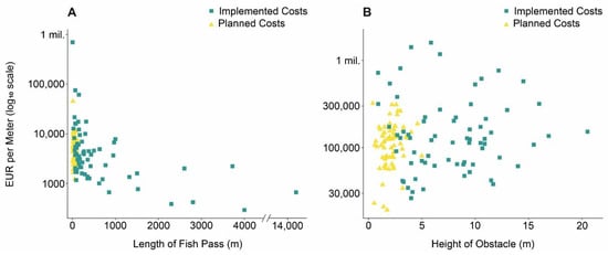 Our study also yielded differences in the monitoring costs of upstream passage measures. The lack of data related to the costs and types of monitoring is evident. Approximately one-third of the case studies reported monitoring costs. However, only eight reported the type and five reported the timeline. While it is unclear whether the case studies simply did not report the costs or whether no monitoring took place, recent studies have noted the dearth of effectiveness monitoring related to fish passage measures []. In contrast, a study of river restoration measures showed that 80% of the projects are monitored []. This may stem from the belief that standardized passage design based on species-specific formulas [] ensures success. Hence, additional monitoring is often not considered necessary and may result in additional costs if functionality is not proven after all. Recent literature argued that most design criteria are primarily based on salmonids in the Northern Hemisphere, which fails to account for the variation in individuals, populations, and species at individual sites [].