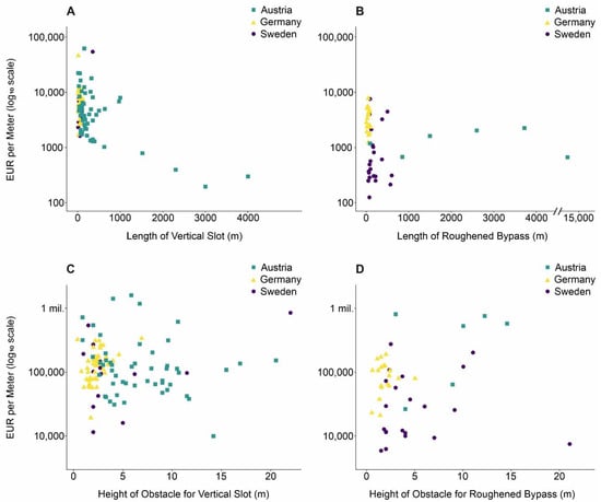 Cost per meter length for vertical slot passes (A, n = 150) and roughened bypass channels (B, n = 60) compared to costs per vertical meter of the obstacle for vertical slot passes (C, n = 150) and roughened bypass channels (D, n = 60).