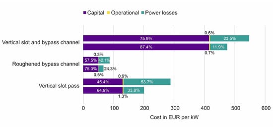 For upstream measures, we hypothesized that capital (construction) costs and power losses account for the largest shares of lifetime costs. Under almost all price scenarios, capital costs accounted for the largest share. However, in the high price scenario for vertical slot passes, power losses accounted for a greater share. This means that when electricity prices are high, power losses may represent a significant concern for operators. However, it is difficult to generalize findings about power losses of measures as there may be significant variation in power loss among sites. Fish passage facilities may be designed to operate only during the migration season []. Thus, they do not necessarily operate year-round. Smart management of water release should ideally be adapted to both fish migration and power production needs. This could potentially reduce power and income loss while still maintaining fish passage. Such solutions depend on site-specific conditions, fish species composition, legal requirements, and operational constraints. Our finding is significant because previous cost reports of fish passage measures primarily focused on construction and operation [], rather than quantifying the role of power losses. As a result of lack of data, a comparison of lifetime costs for downstream passage measures was not possible. Thus, it represents a potential avenue of future research.