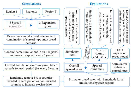 Gilbert and Liebhold [19] conducted a simulation research to evaluate the accuracy of two regression methods and a boundary displacement method on estimating the overall invasion rate in response to different spatial sampling configurations and sampling density. Tisseuil et al. [18] conducted a simulation study to evaluate the accuracy of a regression method and a boundary displacement method on estimating the overall invasion rate with field sampling data under different sampling strategies, densities, and spatial interpolation approaches. Both research provided valuable guidance on estimating the overall spread rate of invasive species with field sampling data [18,19]. However, simulation of spread of invasive species with GULD is rare [11,12,13,14,15,17,18,19]. To fill the research gap of a systematic evaluation of different methods on estimating invasions with GULD, we used a simulated data approach to evaluate the ability of multiple methods on estimating invasion with GULD.