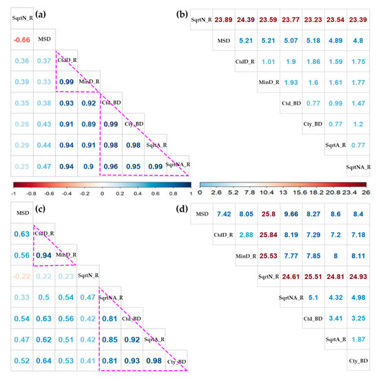 Similarity matrix of eight methods on estimating overall spread rate and spread dynamics. (a,c) Correlation matrix and similarity pattern of estimated overall rate and spread dynamics, respectively, for all regions, expansion patterns, and spread scenarios. (b,d) Root mean square error (RMSE) of estimated overall rate and spread dynamics, respectively, among each method for all regions, expansion patterns, and spread scenarios. Methods that are enclosed in the same triangle are classified in the same group by hierarchical clustering based on similarity of estimated rate.