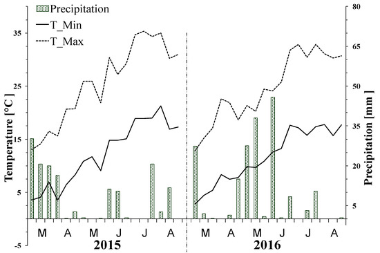 The potato growing period was from March to August and lasted for 106 days in 2015 and 126 days in 2016, respectively. The weather variables as air temperature and rainfall were recorded during the whole potato growing period in both experimental seasons (Figure 1). The cumulated precipitation was higher in 2016 than 2015 (181.0 vs. 147.8 mm, respectively), even if they tended to be distributed differently between the potato growing seasons. Indeed, the precipitation in 2015 growing seasons was mainly concentrated in the first month after potato sowing (about 60% of the total precipitation), while in 2016 the precipitation was mainly distributed in May–June (about 70% of the total precipitation). As expected, minimum and maximum temperatures tended to gradually increase from March to August when the air temperature reached the highest values of the year (35.3 °C and 32.9 °C in 2015 and 2016, respectively). The mean air temperature was higher in 2015 than in 2016 potato growing season (on average 19.0 °C vs. 18.2 °C, respectively).