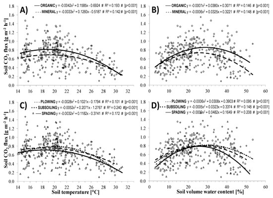 Soil CO2 flux plotted in the two soil fertilization treatments (Organic (dotted line) and Mineral (solid line)) against soil temperature (A) and soil volume water content (B) and the soil CO2 flux plotted in the three soil tillage treatments (Plowing (dotted line), Subsoiling (solid and dotted line) and Spading (solid line)) against soil temperature (C) and soil volume water content (D) during the two potato cycles. The data fit with second-order polynomial regression models.