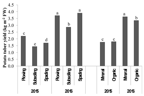 Marketable potato tuber yield was affected by treatments and significant interactions were observed with years (year x soil tillage and year x fertilizer sources) (Figure 5). The potato yield was higher in 2016 than in 2015 (on average 3.49 vs. 1.78 kg m−2 of FW), but there was a different trend among the soil tillage and fertilizer source treatments within the year. In 2016, the marketable tuber yield of potato was higher in plowing and spading tillage compared with subsoiling [on average 2.88 vs. 2.15 kg m−2 of fresh weight (FW), respectively], while in 2015 it was the highest in plowing, intermediate in spading and low in subsoiling (2.20, 1.70 and 1.34 kg m−2 of FW, respectively). In the fertilizer source x year interaction, the highest value of potato yield was observed in 2016 under mineral fertilizer followed by organic fertilizer (on average 3.63 vs. 3.35 kg m−2 of FW, respectively), while no differences were detected in 2015 between the fertilizer treatments.