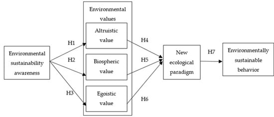 As the environment is threatened due to human overexploitation of nature, environmental awareness is necessary to integrate into our daily life. This dimension is viewed as a fundamental component of environmental education, which is a vital part of environmental values [74]. Following the VBN theory, environmental values perform a major role in activating the personal norms and feelings of having a moral responsibility to save the environment [21]. Moreover, values act as an administrative guide to a greater understanding of the world of an individual’s life. Thus, the three-dimensional orientation of values (i.e., altruistic, biosphere, and egoistic) plays an important role and act as environmental values in steering individual behavior [21,55]. In the term of environmental values, the following hypothetical relationships have formulated: